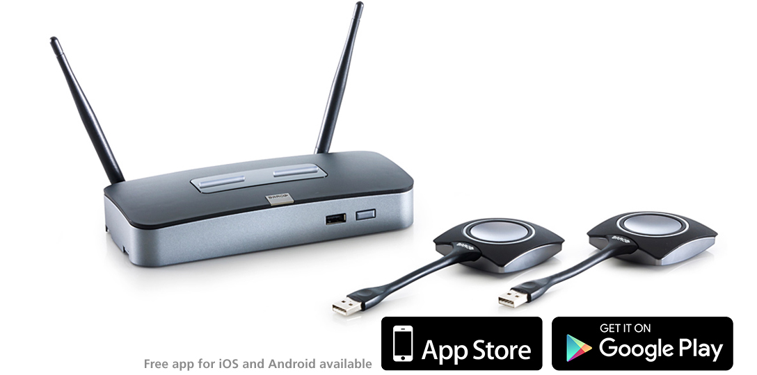 Our ClickShare CSM-1 Mini set consists of up to 5 USB powered devices (the ClickShare Buttons) and a Base Unit. The Base Unit has a fixed connection to the meeting rooms visualization system, and takes care of all the needed processing. Users who want to get their presentation on the large meeting room screen, simply connect a Button to their PC or MAC. They start the application, click the ClickShare Button and immediately their desktop is wirelessly transferred to the large visualization system. Whats more, CSM-1 Mini does not interfere with your laptops resolution, and automatically displays The screen content in the most optimal way.