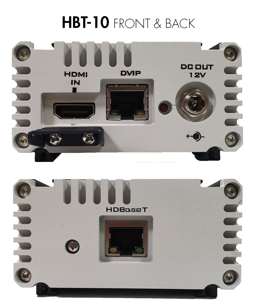 The HBT-10 transmitter can power external devices from the 12V/30W DC output. DVIP control can be achieved over the same Ethernet cable. In other words, HDMI video, DVIP control signals and Power over Ethernet (PoE) can be transmitted between the transmitter and the receiver using a single Ethernet cable.