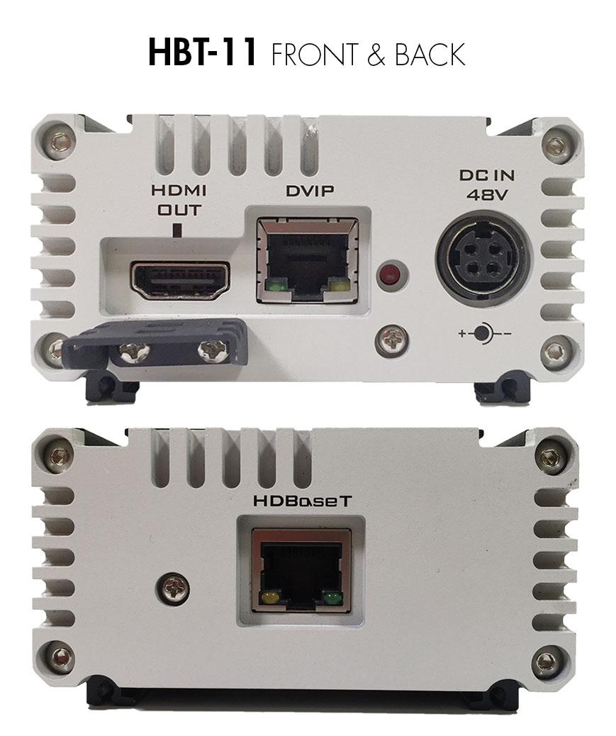 The HBT-10 HDBaseT transmitter and HBT-11 receiver provide a maximum transmission distance of 100 meters. The pair supports video transmission up to 4K resolutions over Ethernet. With a 48V power source connected to the HBT-11 HDBaseT receiver, the HBT-11 can also remotely power the transmitter using Power over Ethernet (PoE).