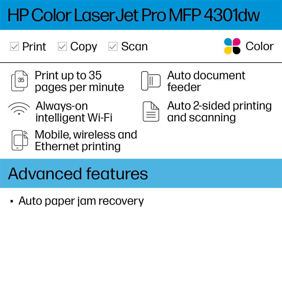 | Included in the Box | HP colour LaserJetPro 4301dw, 4 preinstalled HP LaserJet Toner cartridges, In-box documentation, warranty card |