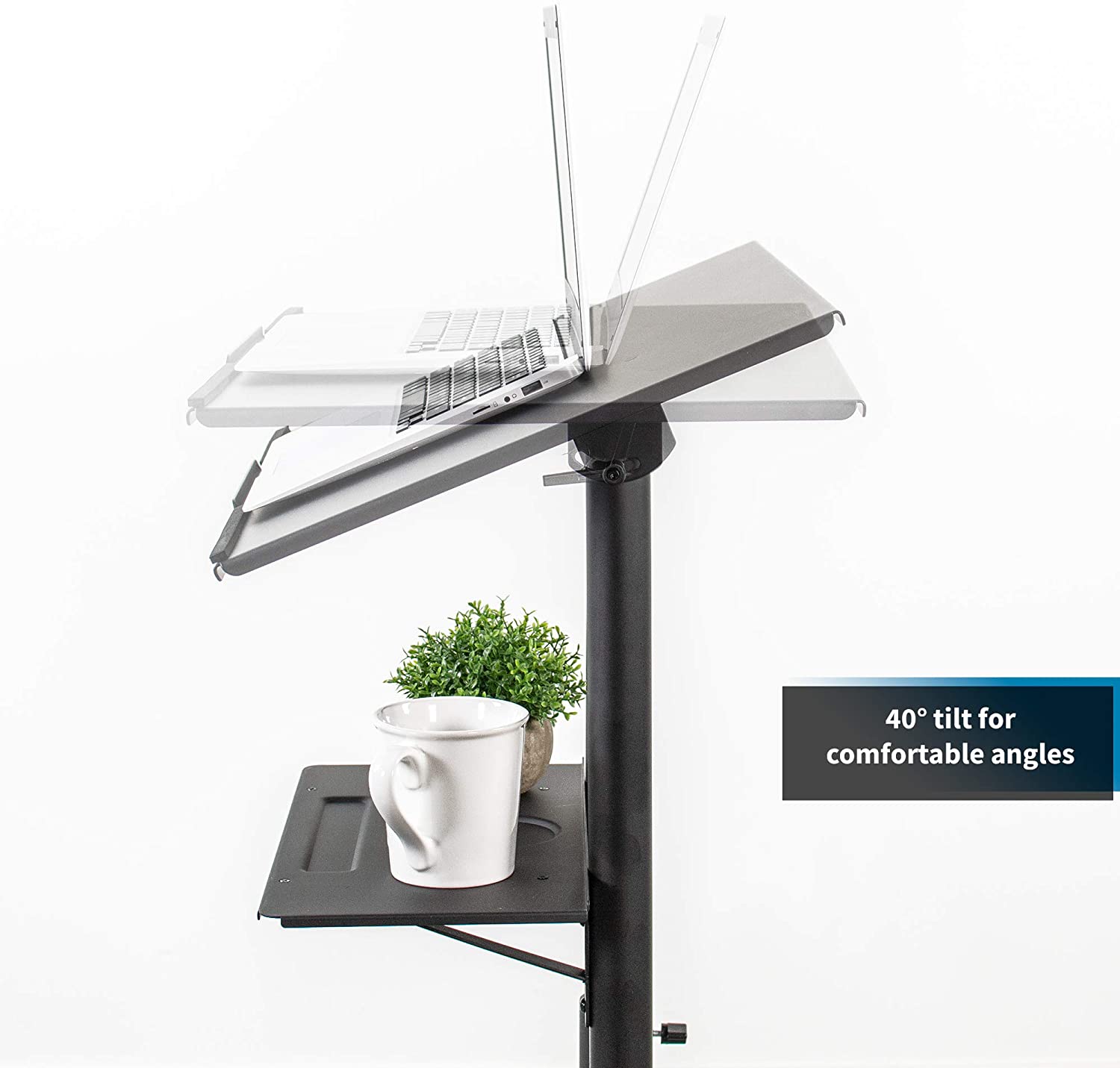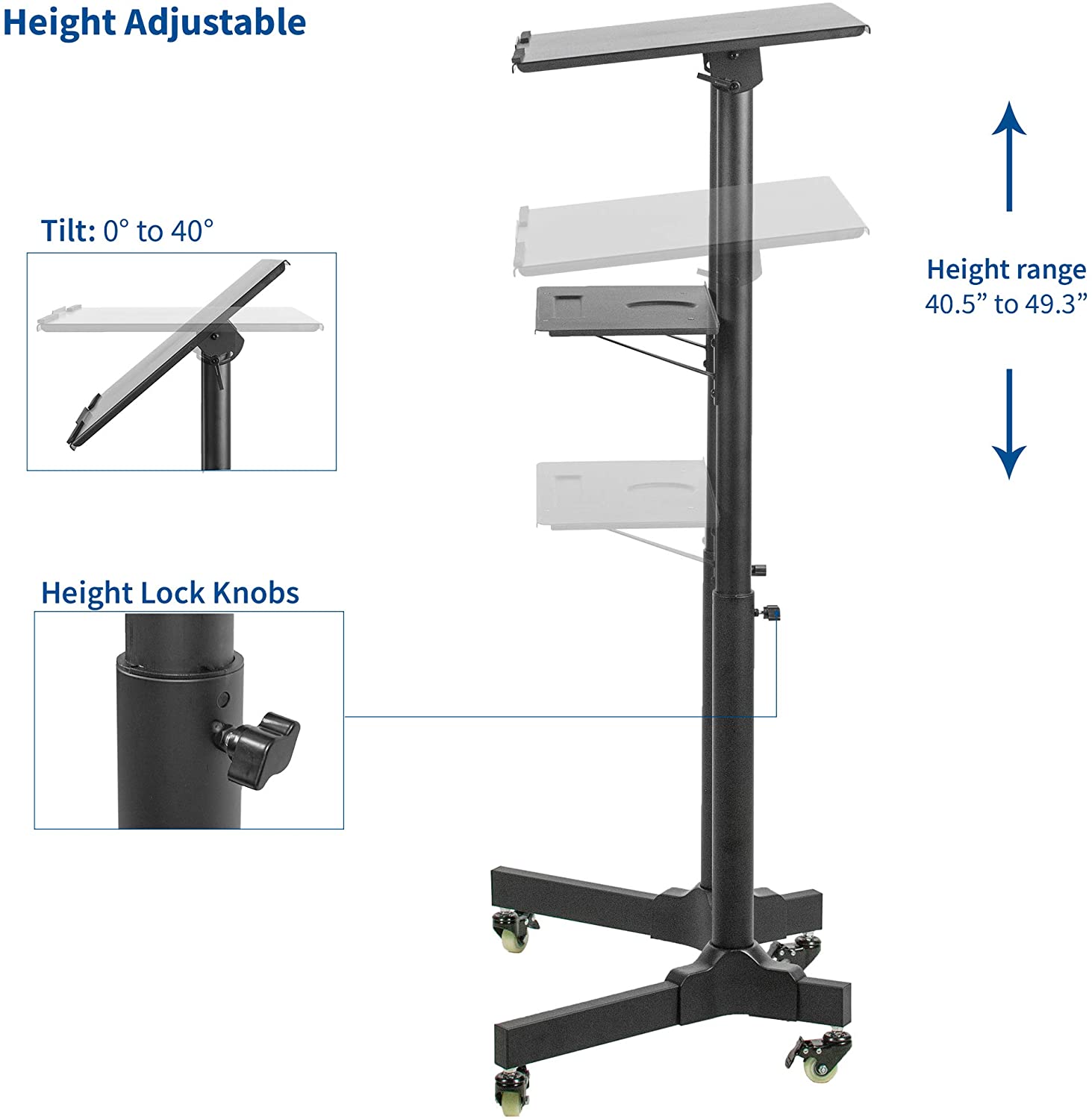Find just the right height with this cart’s adjustment range of 40.5” (minimum height) to 49.3” (maximum height). Ergonomic viewing and typing angles are created with the desktop’s tilting feature, and a metal safety lip prevents equipment from sliding off the platform.