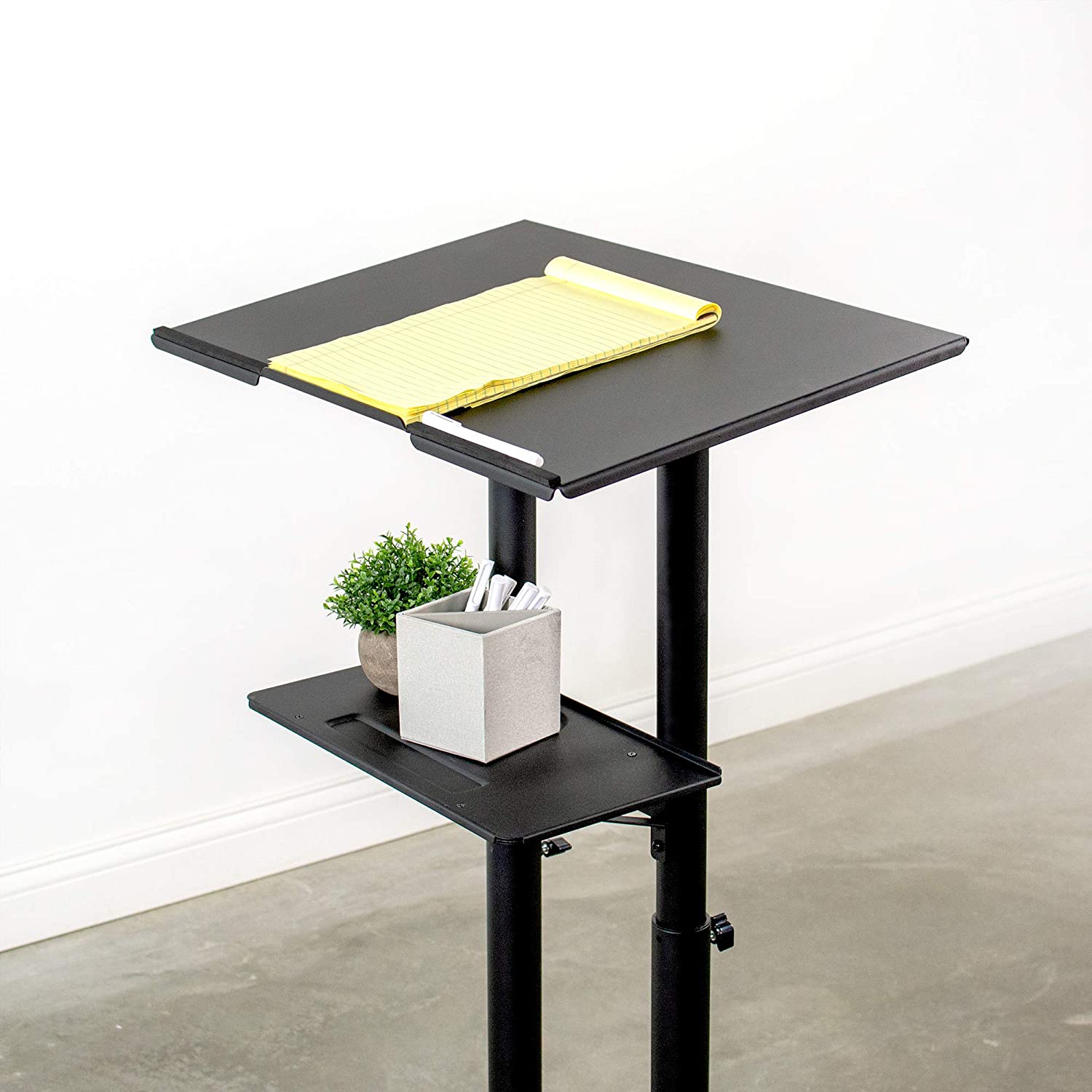 This mobile workstation is the perfect addition to any small office space, classroom, showroom, and more! Ideal to use as a laptop workstation, mobile podium, or small drawing table, its adjustable features and convenient layout will help you get organized in no time!
